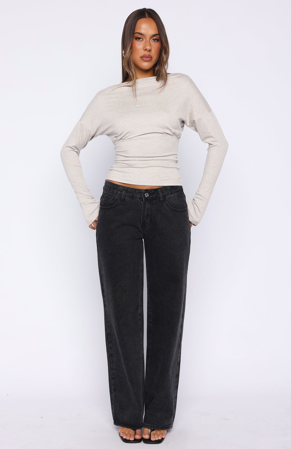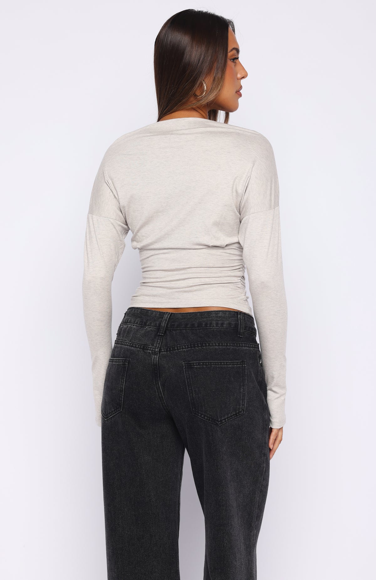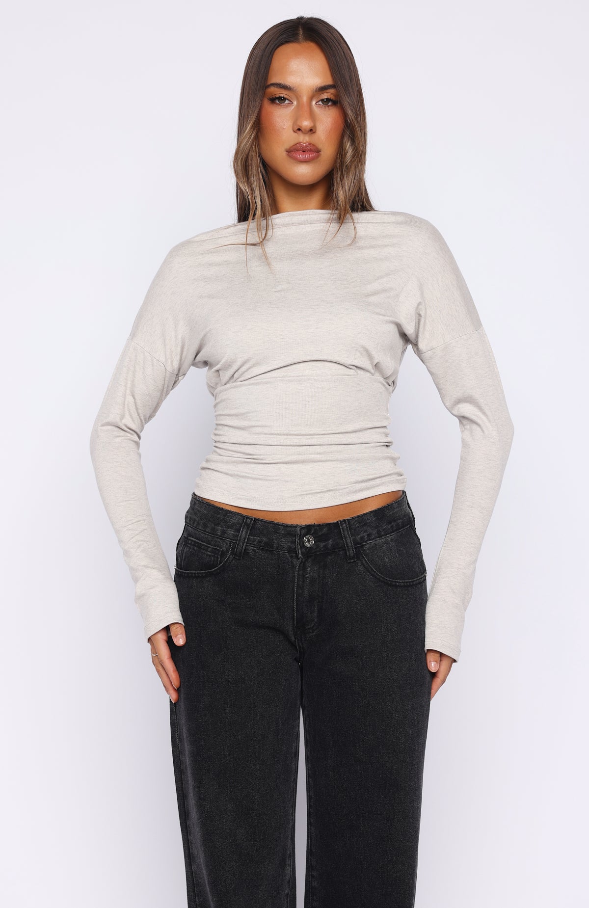 Another Time Cinched Waist Long Sleeve Top Light Grey Marle